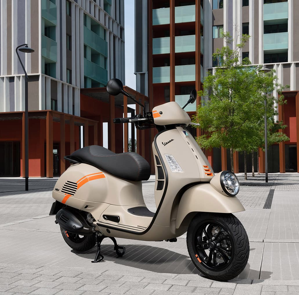 La nuova Vespa Gtv è disponibile nelle due colorazioni Beige Avvolgente Opaco e Nero Convinto, con grafica arancione a contrasto sul cupolino e sulle fiancate.