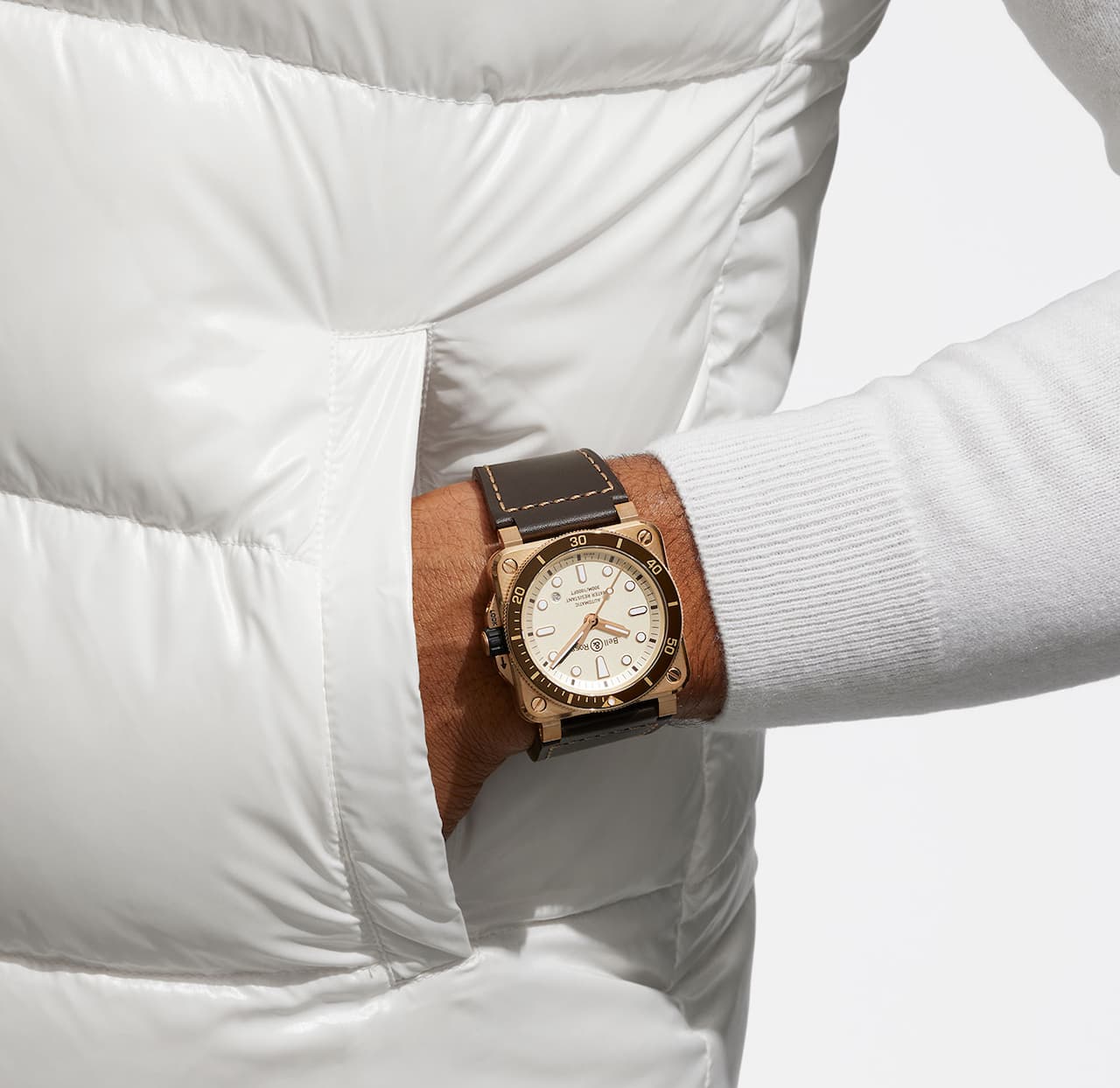 Dieci anni dopo, presenta un secondo modello della collezione BR 02 specificatamente dedicata al mondo subacqueo. Con la sua cassa a forma tonneau, questa famiglia di orologi è riconoscibile al primo sguardo. Tecnicamente parlando, il BR 02 è dotato di una valvola di decompressione dell’elio e un vetro zaffiro bombato ultra-resistente: elementi essenziali per le immersioni in saturazione. Tuttavia, non tutti gli orologi diver della collezione di Bell & Ross sono rotondi. A partire dal 2017, la maison orologiera ha assunto una nuova estetica con l’arrivo del modello BR 03-92 Diver. Parte della famiglia BR 03 di orologi strumento per professionisti e civili, in vero stile orologiero, reinterpreta perfettamente la funzionalità dei pannelli di controllo degli aerei da combattimento, presentando la caratteristica cassa “rotondo all’interno del quadrato”.