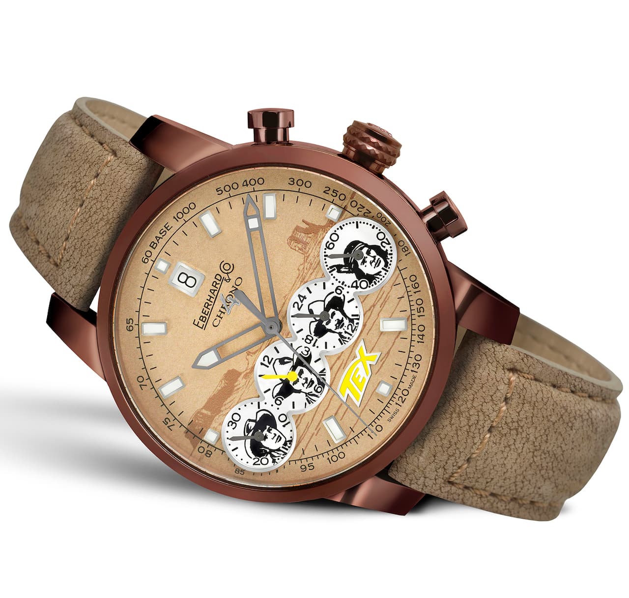 In occasione del 75º anniversario di uno dei più noti personaggi del fumetto italiano, Eberhard & Co. crea una speciale edizione di Chrono 4, una delle icone della Maison. Un cronografo fortemente riconoscibile e rappresentativo della storia della Marca: il primo nella storia dell’orologeria ad avere quattro contatori allineati in orizzontale, grazie a un rivoluzionario dispositivo brevettato. I contatori sono quattro, come quattro sono i “pards” – Tex WillerKit CarsonKit Willer e Tiger Jack – i compagni di avventure protagonisti del leggendario fumetto, che vengono ritratti sui contatori dei minuti, delle ore, delle 24 ore e dei piccoli secondi della collezione.
