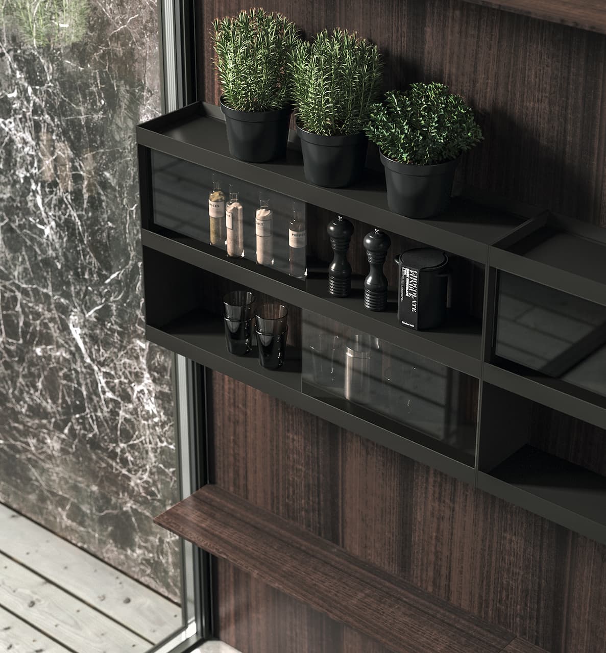 Tra le principali novità, il modulo di ingresso Pass System. Dotato di maniglia opzionale, può essere collocato tra le colonne d’arredo o tra una boiserie a parete permettendo di separare e accedere ad ambienti con funzioni diverse: un elegante trait d’union nell’habitat dinamico della convivialità.