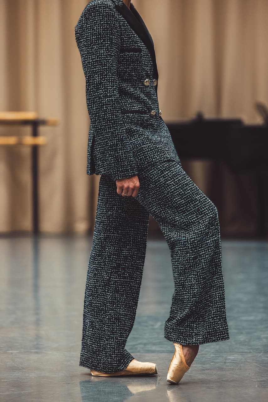 Ispirati a una silhouette della collezione Ready-to-Wear Primavera-Estate 2023, tre body apparentemente identici, impreziositi da un grande fiocco di raso nero e indossati sotto shorts in georgette abbinati, si distinguono per minute variazioni in rosa che risaltano sul rettangolo nero di il palco e le poltrone di velluto rosso del set. La loro vibrante delicatezza dialoga con l’elegante sobrietà dei tailleur pantalone con risvolto in raso in tre diversi tweed in sottili sfumature di bianco e nero. Giocando sull’idea di maschile-femminile tanto cara a Nicolas Paul e alla Maison, i costumi sono una parte fondamentale della coreografia. Calzate con scarpette da punta di raso, le ballerine cambiano sul palco, dal body al tailleur pantalone. I bottoni gioiello dorati sugli abiti riflettono la luce, mentre la naturale morbidezza del tweed rivela la grazia di ogni movimento. Attraverso i costumi di questo balletto, la Maison rinnova il suo legame storico con il mondo della danza, avviato da Gabrielle Chanel più di un secolo fa, ribadendo il suo sostegno a tutte le attività dell’Opera di Parigi.
