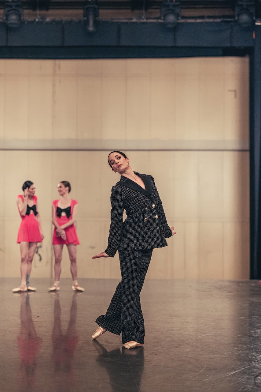 Ispirati a una silhouette della collezione Ready-to-Wear Primavera-Estate 2023, tre body apparentemente identici, impreziositi da un grande fiocco di raso nero e indossati sotto shorts in georgette abbinati, si distinguono per minute variazioni in rosa che risaltano sul rettangolo nero di il palco e le poltrone di velluto rosso del set. La loro vibrante delicatezza dialoga con l’elegante sobrietà dei tailleur pantalone con risvolto in raso in tre diversi tweed in sottili sfumature di bianco e nero. Giocando sull’idea di maschile-femminile tanto cara a Nicolas Paul e alla Maison, i costumi sono una parte fondamentale della coreografia. Calzate con scarpette da punta di raso, le ballerine cambiano sul palco, dal body al tailleur pantalone. I bottoni gioiello dorati sugli abiti riflettono la luce, mentre la naturale morbidezza del tweed rivela la grazia di ogni movimento. Attraverso i costumi di questo balletto, la Maison rinnova il suo legame storico con il mondo della danza, avviato da Gabrielle Chanel più di un secolo fa, ribadendo il suo sostegno a tutte le attività dell’Opera di Parigi.