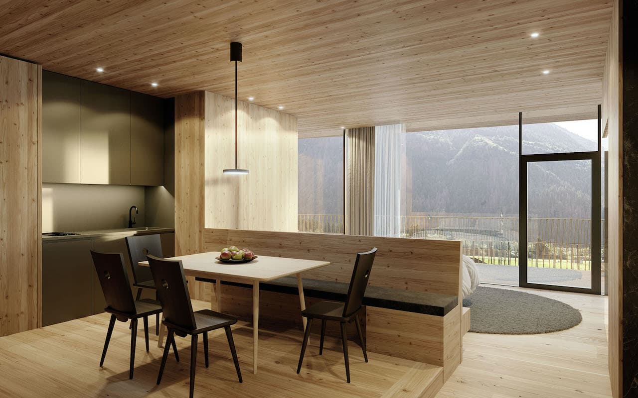 In questo luogo, prima ancora della struttura vera e propria studiata dall’architetto Andreas Gruber, ha preso vita un concetto diverso e nuovo di eco-aparthotel basato sul ciclo della natura e fondato sulla valorizzazione dell’ambiente, la promozione del territorio e l’utilizzo di materiali naturali del posto nel totale rispetto della natura circostante, quali il legno, le fibre naturali e la pietra. Se l’ecosistema impregna così di fatto i muri di un’avventura che lo accoglie come fonte d’ispirazione, la sostenibilità guida il progetto fin da un design che si integra col territorio e da principi architettonici ispirati a cardini logici e razionali della bioarchitettura, come la filiera corta, la produzione di energia autonoma e l’impiego di risorse idriche, provenienti in questo caso dal pozzo artesiano.