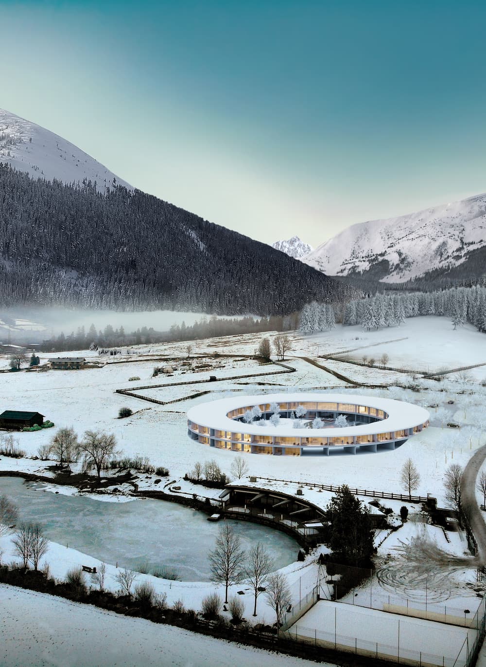Immaginato o reimmaginato? Il senso del sorgere senza lacerare è in effetti presente fin dalla genesi di un progetto che nasce come ampliamento di un preesistente garnì, anima tradizionale di un edificio di 33 unità. È il nome stesso a suggerire l’idea ciclica, che esclude la prospettiva della distruzione per promuovere invece quella di un ritorno perenne al passato e al futuro: in dialetto altoatesino, “Olm” ha quel doppio significato di “malga” e di “continuità” che ha guidato la mano e la mente nel disegno di una struttura circolare, del diametro di 110 metri, a evocare l’aspirazione all’infinito, all’eternità, al dissolvimento della conclusione e dell’inizio, all’abbraccio in cui il tempo cinge lo spazio. All’occhio dell’epoca moderna che rivisita la tradizione alpina della malga, qui evocata tanto nei materiali quanto nell’ambizione di trasmettere non solo il calore ma anche il lusso dell’immersione nella libertà e nel silenzio.