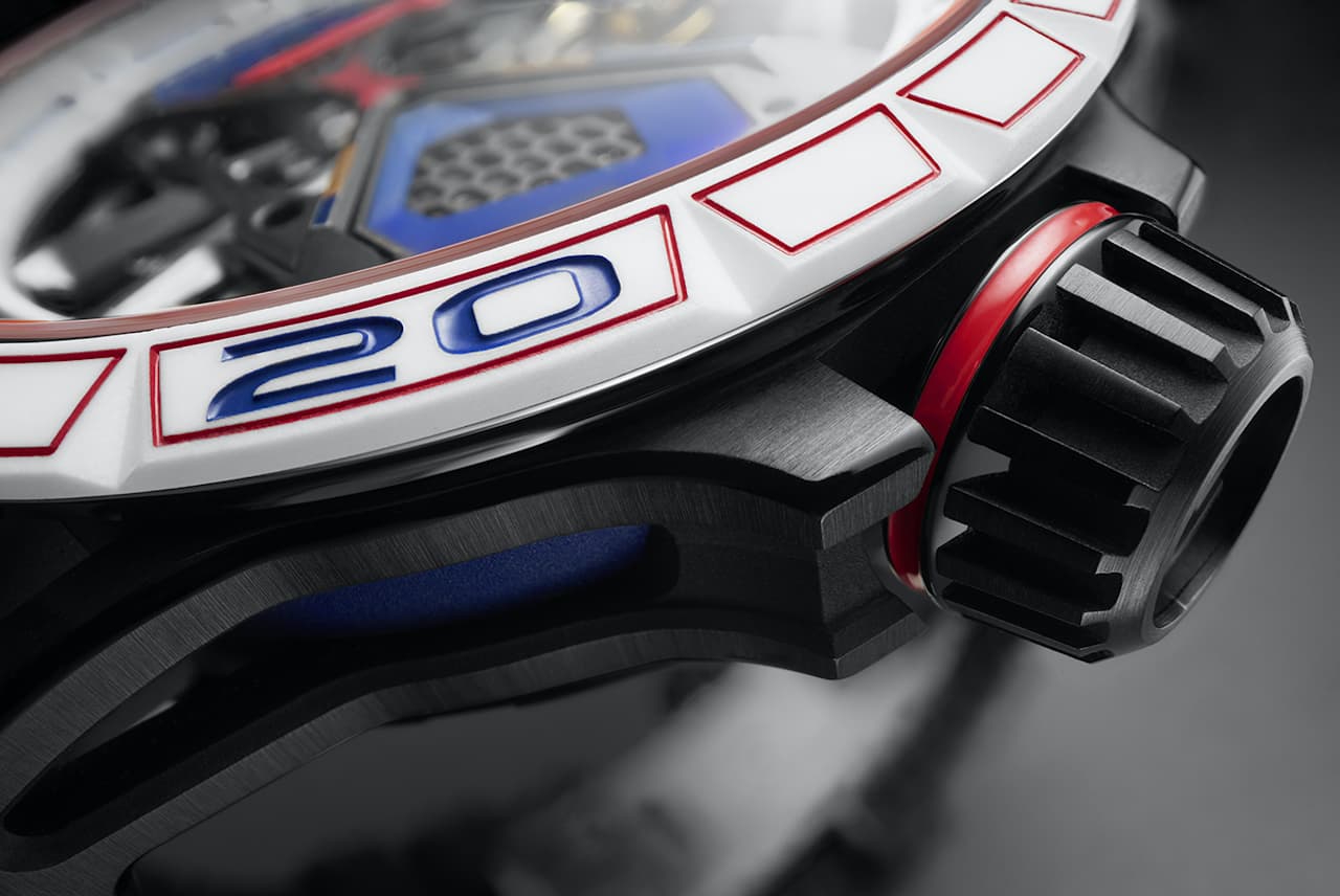 Il design del nuovo Excalibur Spider Huracán Monobalancier di Roger Dubuis si ispira alla lunga collaborazione di Roger Dubuis con Lamborghini Squadra Corse, mentre la colorazione abbraccia l’iconica fusione di rosso, bianco e blu, come omaggio all’emblematica livrea da corsa dei decenni passati. Dopo aver creato un segnatempo eccezionalmente innovativo, i meticolosi orologiai di Roger Dubuis lo hanno arricchito di dettagli che si ispirano al mondo delle corse automobilistiche, riproducendo le linee scultoree e le caratteristiche della celebre Lamborghini Huracán.