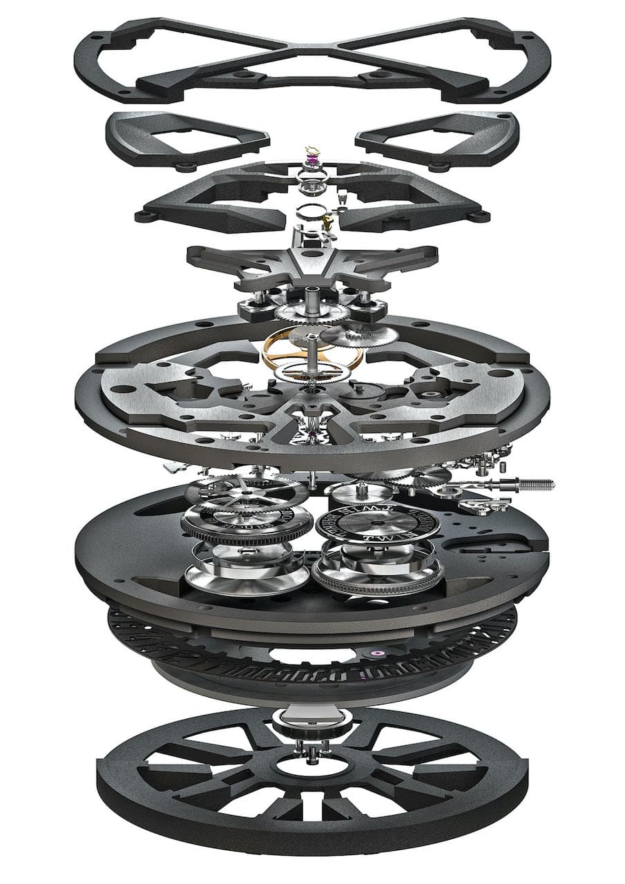 Si noterà che il calibro di questo straordinario Monobalancier richiama le forme delle iconiche prese d’aria delle supercar, mentre i doppi bariletti, posizionati tra le ore 5 e le ore 7, sono un’altra caratteristica distintiva degli orologi Huracán della Maison.