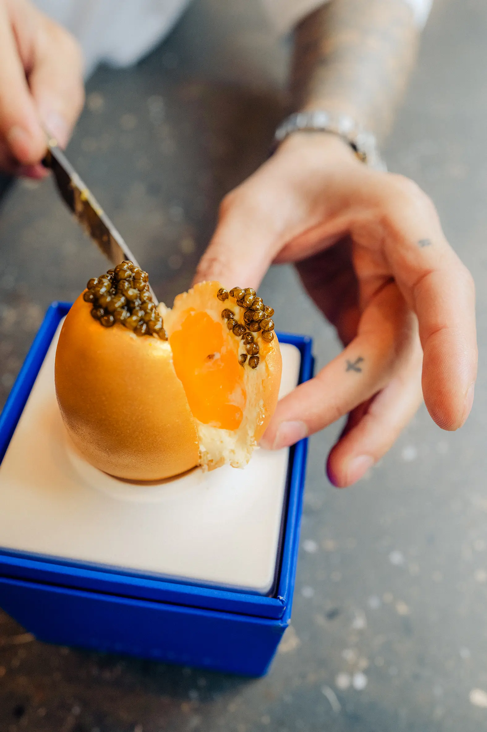 Ispirato dalla ricchezza vitale del caviale, lo chef Grolet ha integrato con maestria questa prelibatezza in un lussuoso pasticcino trompe l’oeil a forma di uovo, elevandone il sapore a nuove vette. La creazione è presentata in una scatola su misura blu cobalto, il colore simbolo della Skin Caviar Collection di La Prairie.