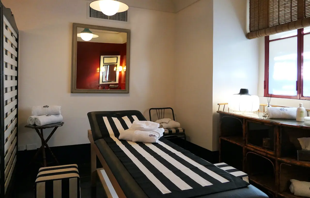 Creato e concepito pensando al Sol Levante e agli interni Mid Century: il pavimento in linoleum, la libreria Fifties in legno che si trasforma in scaffalatura funzionale dove riporre fitball e palle ginniche, le lampade-lanterne a sospensione che rimandano alle Akari Light Sculptures di Isamu Noguchi, le paratie in legno che divengono moderni paraventi giapponesi.