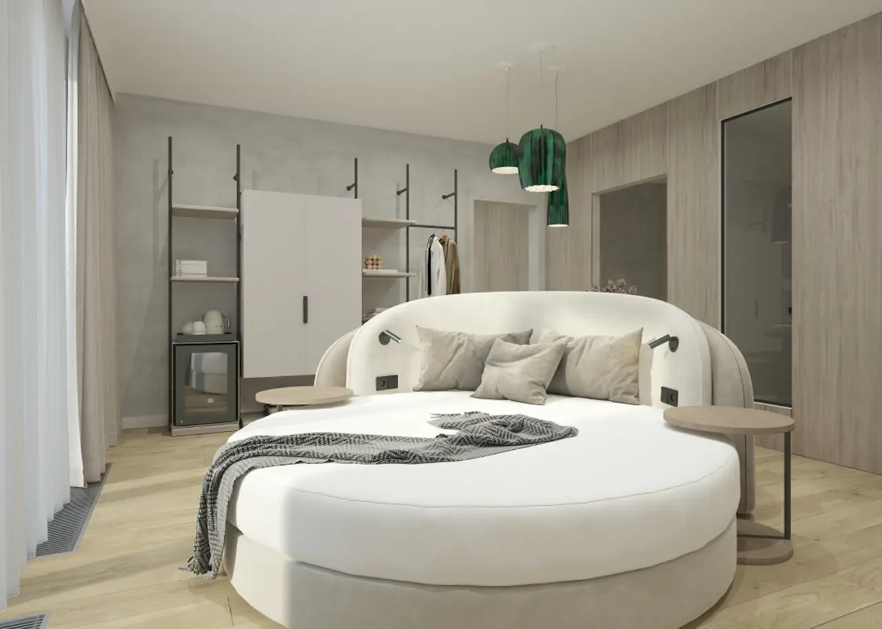 Le 125 camere – di cui 18 suite – dallo stile moderno ed essenziale, sfruttano i principi dettati dall’eco climatizzazione per la veicolazione dell’energia naturale senza utilizzo di radiatori e condizionatori. Davvero particolare l’esperienza offerta dalle due nuovissime Prestige Round Suite dal design contemporaneo e dall’atmosfera soffusa; i colori sono tenui e qua e là spicca un tocco di verde così da rendere l’ambiente un tutt’uno con la rigogliosa corte interna. Un ampio ed elegante living conduce nella camera con l’originale letto rotondo e vasca Jacuzzi, una vera e propria oasi di relax.