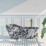 Venature e nuance uniche, insieme alla cura di spessori ed ergonomia, esprimono le collezioni di vasche freestanding Kreoo. Il loro design nasce dal marmo, intagliato da un unico blocco e lavorato mediante la combinazione di processi industriali e procedure manuali: si mescola a legno e metallo e defjnisce oggetti preziosi e customizzati nei quali ritrovare un momento di benessere personale. Ad aver firmato queste famiglie prodotto sono Matteo Nunziati, con Hug, Alberto Apostoli con Pearl, Enzo Berti con Kora e Kalypso, e il centro stile e ricerca del brand con Venice: cinque soluzioni con una propria e unica identità estetica, capaci di plasmare la pietra naturale e di portarla alla massima espressione.