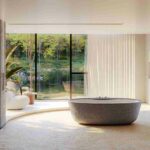 Un bacino morbido definisce anche Kora: appare come un monolite scavato da un unico blocco con un profilo superiore ad altezze variabili che ne agevola l’ingresso e crea un risultato di grande raffinatezza. La vasca è sollevata da un cavalletto con finitura oro, bronzo scuro o nero opaco, e sembra fluttuare su questa esile struttura metallica, in un design straordinario.
