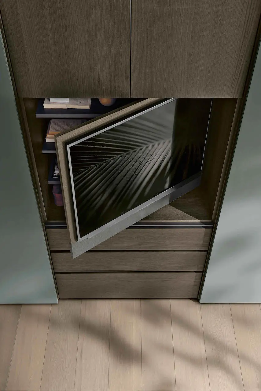 Per completare la zona notte Tomasella presenta una nuova soluzione: vano a giorno porta TV Vista, “dettaglio” disponibile per tutti gli armadi scorrevoli dell’azienda. Il modello è orientabile per garantire una visione perfetta dello schermo da qualsiasi angolo della camera. Una soluzione che offre il massimo in termini di personalizzazione e organizzazione degli spazi grazie all’ampia gamma di finiture.