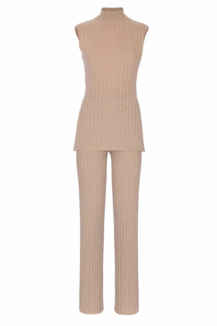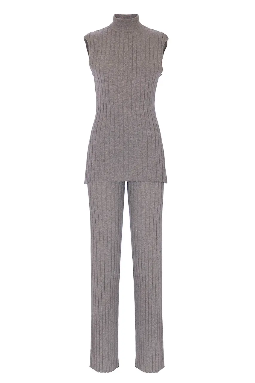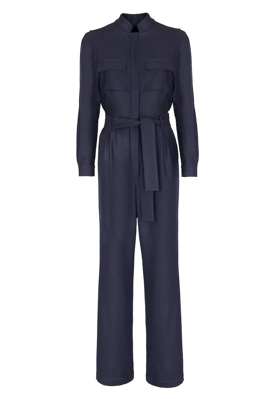 Completo, in grigio o in beige, in puro cashmere a costa larga, composto da top lupetto smanicato e pantalone con coulisse in vita. Jumpsuit in lana vergine e cashmere, in blu navy, con colletto alla coreana, quattro tasche e cintura in vita.