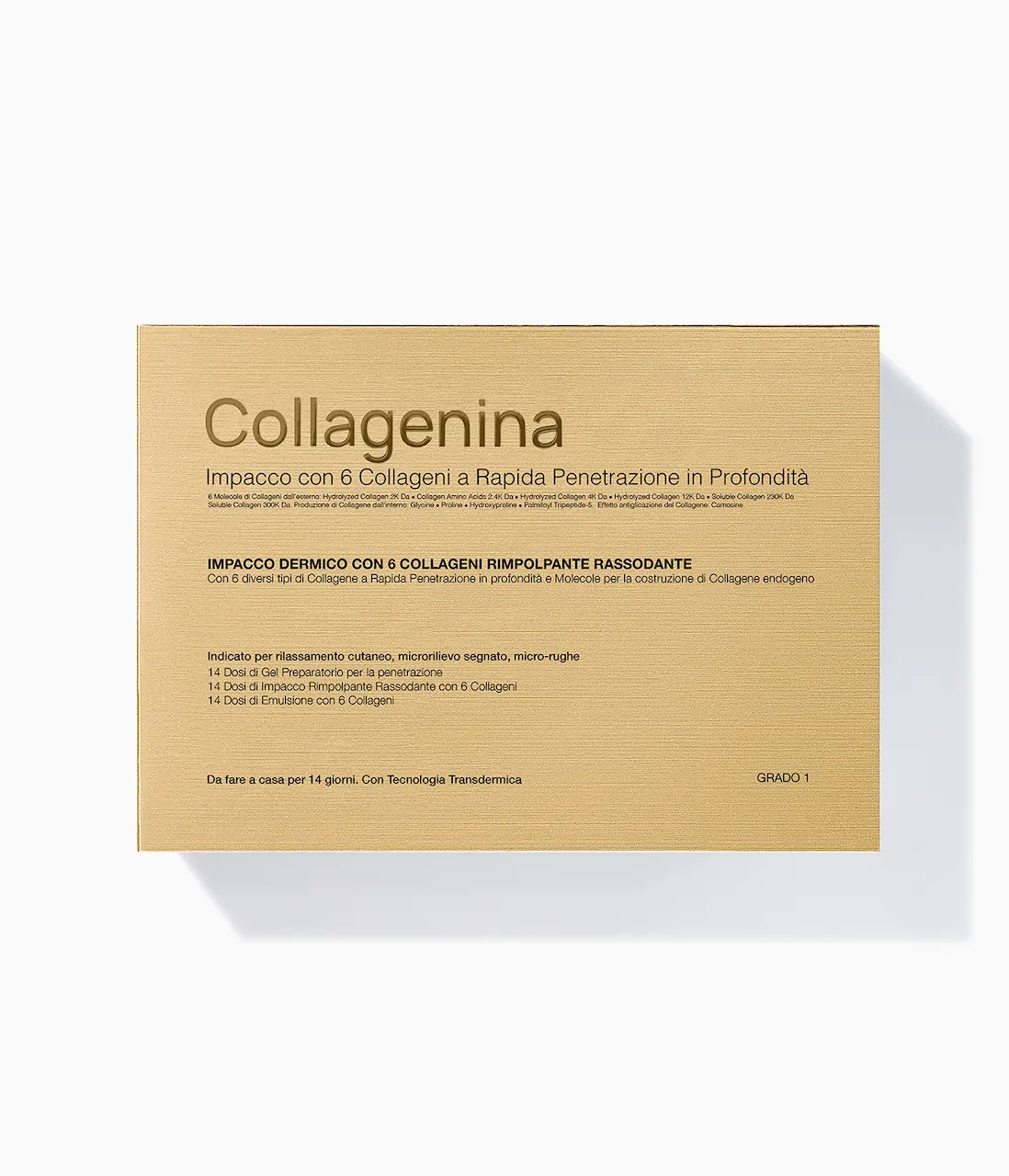 La gamma COLLAGENINA comprende il trattamento intensivo denominato Impacco Rimpolpante Rassodante con 6 Collageni a Rapida Penetrazione in Profondità, e i preparati quotidiani Crema Giorno (trattamento quotidiano da giorno rimpolpante rassodante a base idratante e protettiva), Crema Notte (trattamento quotidiano da notte rimpolpante rassodante, a base ricca adatta all’utilizzo notturno) e Crema Collo (da applicare al mattino e/o alla sera sul collo dal basso verso l’alto facendo assorbire con leggero massaggio). Tutti contengono 6 Collageni.