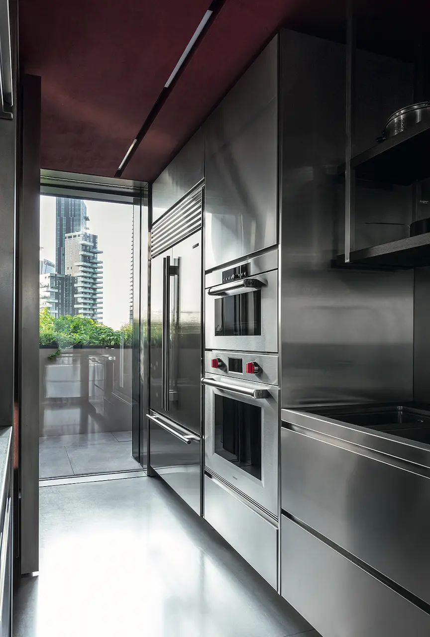Atelier si configura in due aree distinte: una operativa, caratterizzata da una finitura satinata che rende la superficie opaca e leggermente riflettente, conferendo all’acciaio un aspetto elegante e contemporaneo (può contribuire, inoltre, a mascherare eventuali segni di usura o graffi che potrebbero verificarsi nel tempo), e una di servizio che ‘comunica’ con la prima grazie a un pratico passavivande che si estende fino alla zona living. La parte operativa, oltre a comprendere la zona di lavaggio e lo spazio di lavoro, è super accessoriata ed equipaggiata con le più avanzate tecnologie professionali per la cottura, la preparazione, la conservazione e refrigerazione del cibo, grazie anche agli elettrodomestici Sub Zero & Wolf di Frigo2000.