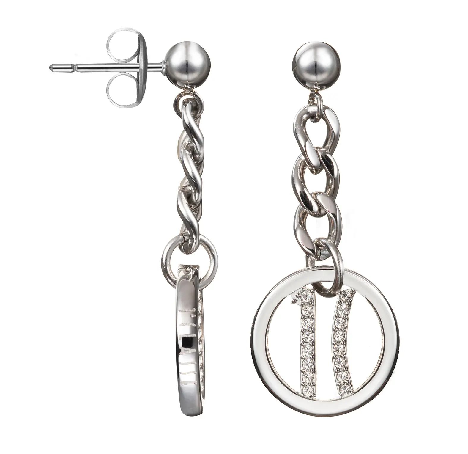 Gli orecchini dal design moderno ed elegante si declinano in due versioni. Il primo modello stud rappresenta il logo in acciaio dorato (29 euro), il secondo in acciaio è pendente, composto di una catena che culmina nell’iconico monogramma con cristalli (39 euro).