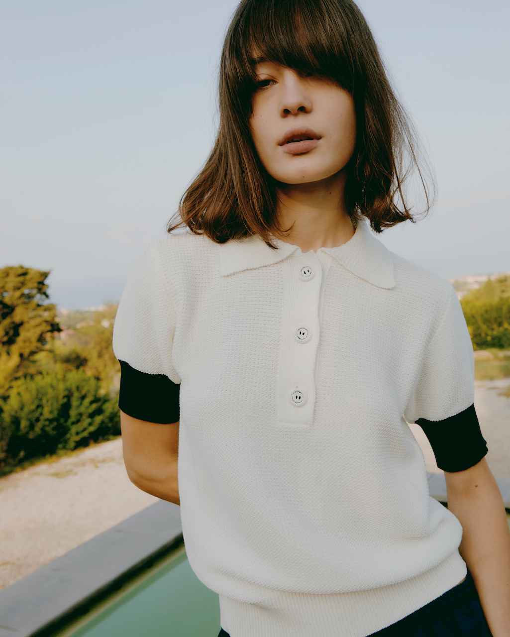 Il cappotto con collo sciallato in lavorazione double, capo iconico del brand, rappresentativo delle alte maestranze e della tecnica modellistica. Le maglie e gli abiti presentano aperture laterali o sulle spalle, gli scolli a barca sulle vestibilità femminili e multifunzionali, dettagli che scoprono le spalle ai raggi del sole. In cotone cablè, che restituisce un effetto pulito e rotondo, sono stati realizzati polo, abitino e bomberino, super femminili, con polsini a contrasto.