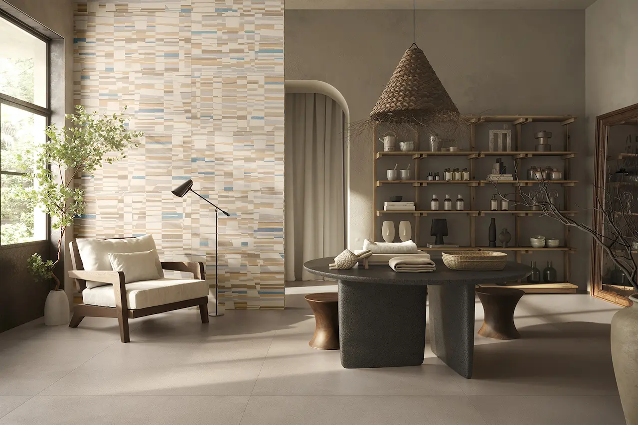 La palette cromatica traduce scenari naturali, con una spiccata propensione per le nuance calde, interpretate con raffinatezza nelle diverse scale tonali: i toni neutri Dune, Ecru e Linen dialogano con le proposte Camel, Jasper e Earth suggerite dai cromatismi delle terre e delle sabbie. La nuova finitura opaca Matt-pro proposta risulta piacevolmente morbida al tatto pur mantenendo una buona resistenza allo scivolamento grazie alla leggera struttura, che garantisce al contempo facilità di pulizia.