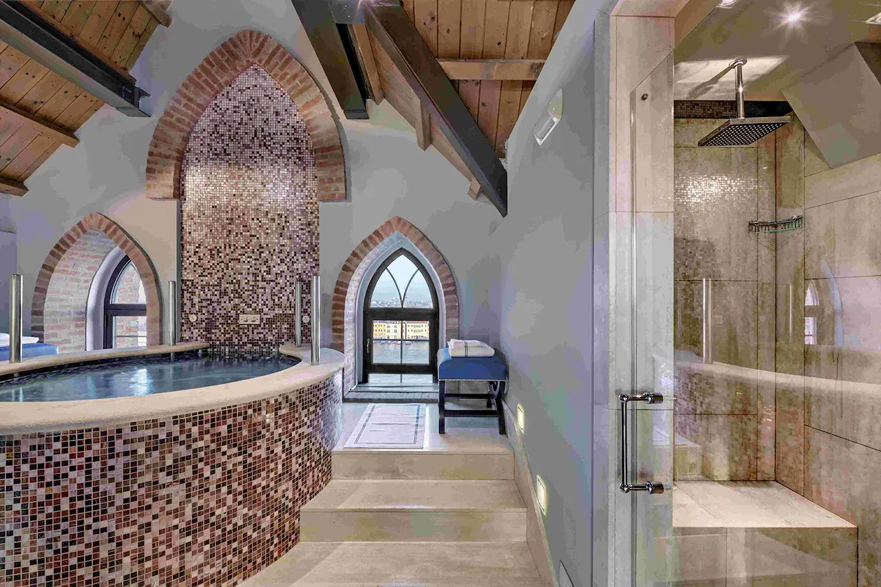 La Suite Presidenziale è un esclusivo nido d’amore, con i suoi spazi ampi e suggestivi, la sua eleganza sussurrata, il calore e il fascino dell’interior decoration reso unico dalla magnifica vista su Venezia. La torretta, cui si accede in esclusiva dalla suite, è uno dei punti più alti della laguna, ed è senza alcun dubbio il luogo più romantico della città. Gli ospiti vengono accolti da un calice di prosecco accompagnato da fragole, e dopo un momento di relax nelle stanze e nei saloni, potranno indulgere nella zona wellness privata della suite, concedendosi un momento di benessere nella jacuzzi e un meraviglioso massaggio di coppia.