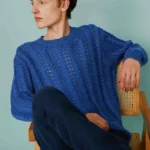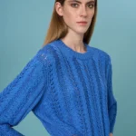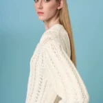 Cardigan integrale in cotone e cashmere, lavorato con trecce spostate per offrire un senso di leggerezza, in bianco panna. In bianco panna e anche in azzurro intenso, la maglia girocollo in cotone e cashmere, con la stessa lavorazione a trecce.