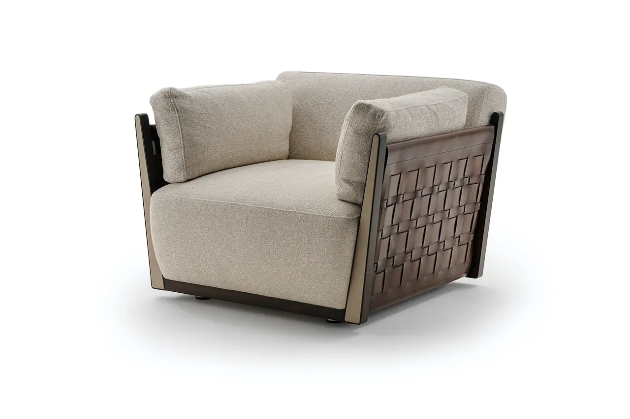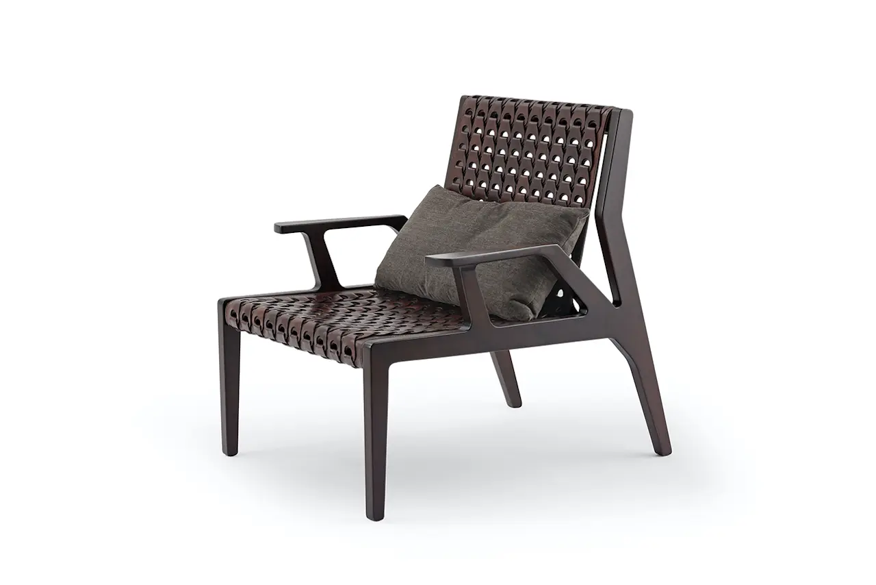 Anche in questo modello, è l’equilibrio di contrasti tra la linea contemporanea ed elegante e il carattere forte del cuoio intrecciato che difende e, allo stesso tempo, si fa garante di un prodotto di lusso in grado di interpretare la cultura internazionale dell’abitare.