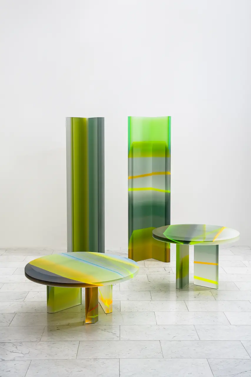 Ispirati dallo studio sulla tridimensionalità del colore dell’artista sud-coreano Jiyong Lee e dalla complessa tecnica compositiva di Vasa Mihich per le sue sculture in acrilico, Draga & Aurel si concentrano sul concetto di rifrazione, che nasce dalla composizione e scomposizione della materia. Le lastre colorate di lucite, di diverse forme e spessore, vengono accostate per ottenere interessanti sfumature e quindi nuovamente tagliate e rincollate per generare su ogni pezzo un fascio di luce inaspettato, una sorta di Epifania per lo spettatore.