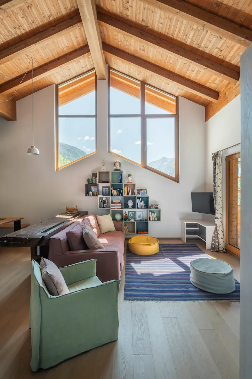 L’architetto Martino Cossard di Gressan è stato incaricato di progettare un edificio che riecheggiasse l’architettura Walser, tipica della zona, caratterizzata da doppi corpi in pietra e legno, tetti a due falde e strutture chiamate “Stadel“. La sfida principale è stata integrare l’edificio nell’ambiente naturale senza comprometterne l’armonia. In questo modo, l’architettura risultante ha saputo valorizzare la forma allungata del fabbricato, con ampie vetrate che offrono panorami mozzafiato sulla montagna e sull’ambiente circostante. “Abbiamo voluto intervenire con delicatezza, mantenendo il senso della tradizione”, spiega Cossard.