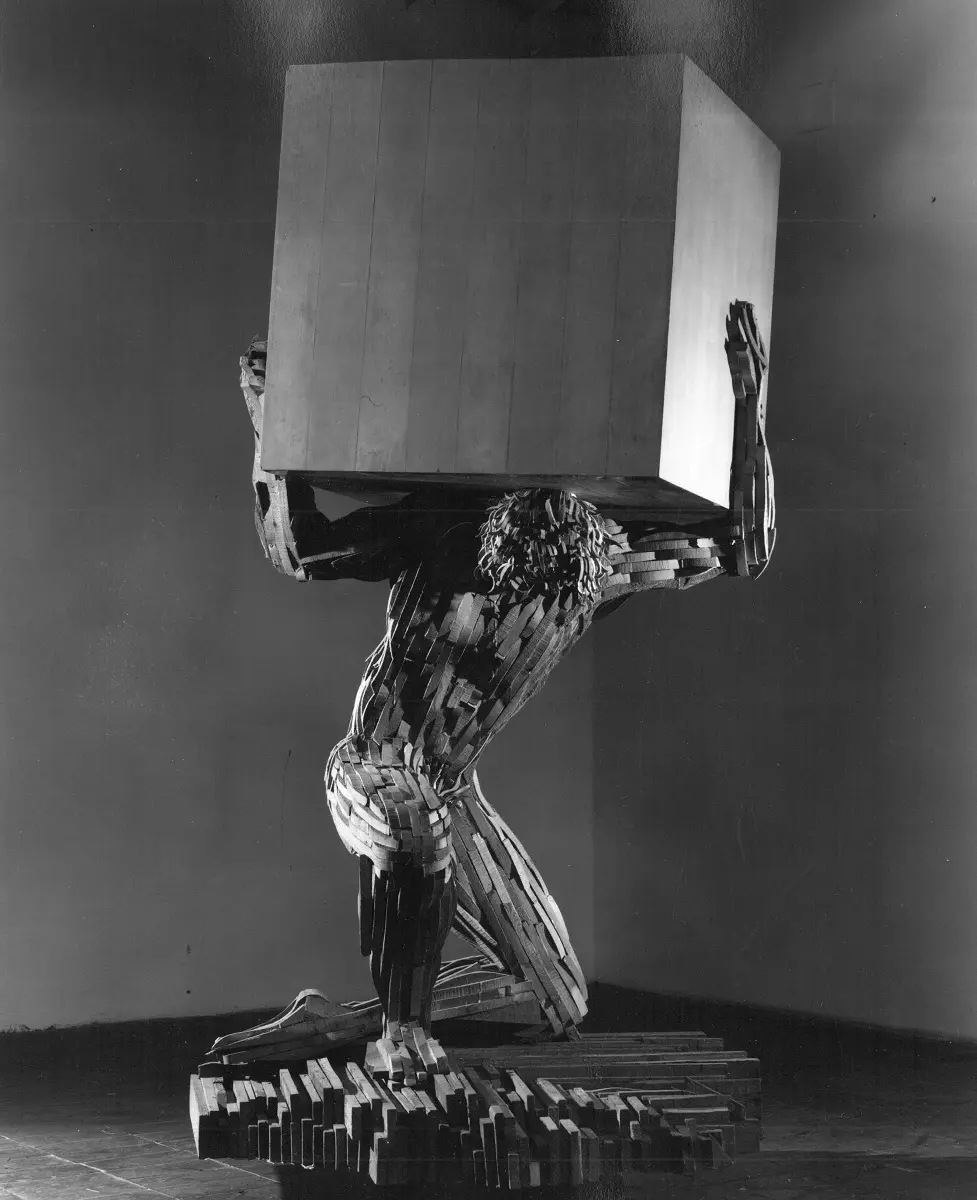 Traendo ispirazione dall’iconografia tradizionale che vede il proprio esempio fondamentale nell’Atlante Farnese del II secolo d.C., Mario Ceroli raffigura i suoi giganti in pose che trasmettono un senso di sofferenza e fatica, traducendone al contempo i muscoli e il corpo in forme modulari che rimandano ai cubi, coni, prismi e piramidi che sono condannati a trasportare.
