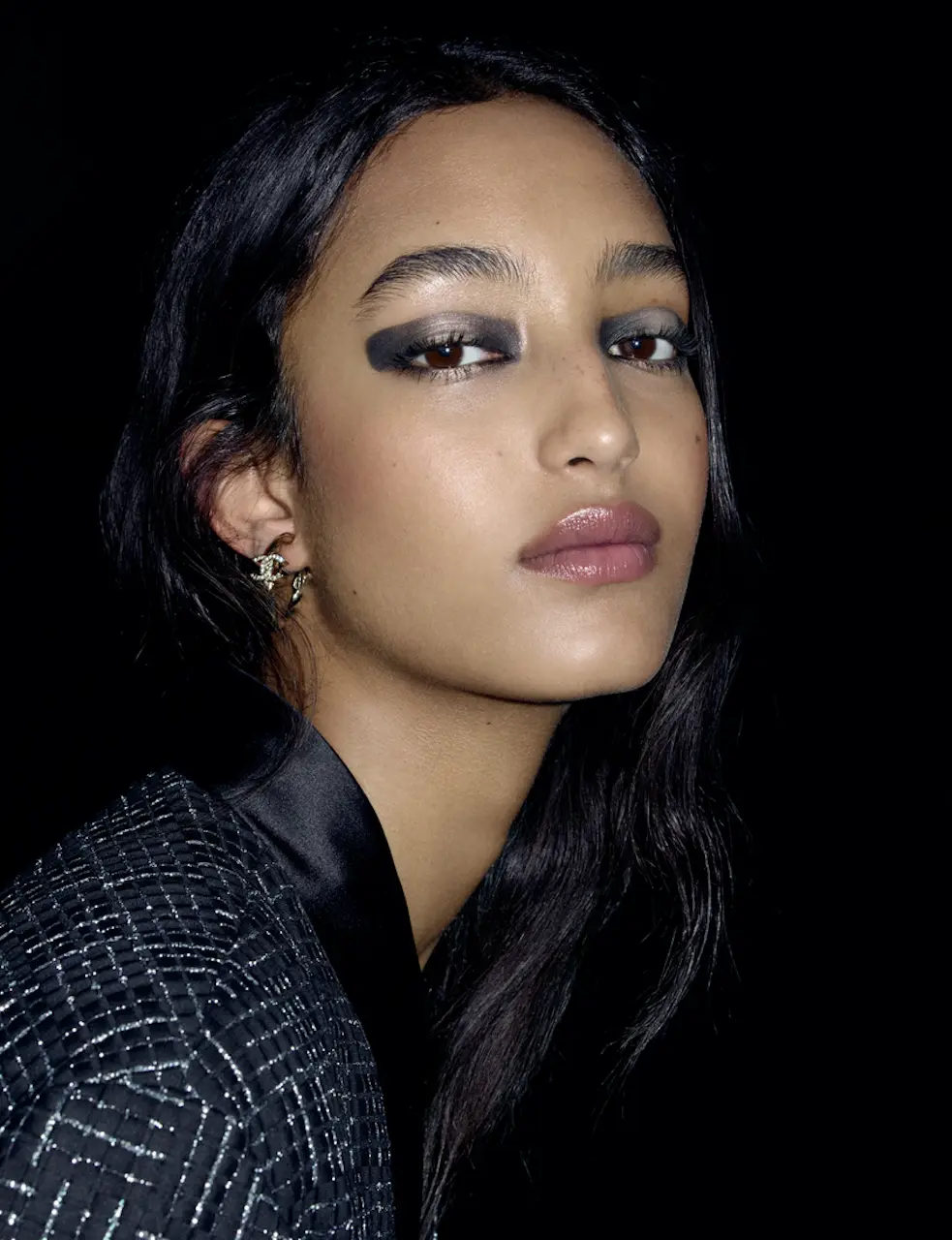 Sottolineato da un flash di colore ed esaltato da ciglia nero intenso, lo sguardo effetto smoky gioca con la palette di tinte dorate e metallizzate per un seducente effetto chiaroscuro.