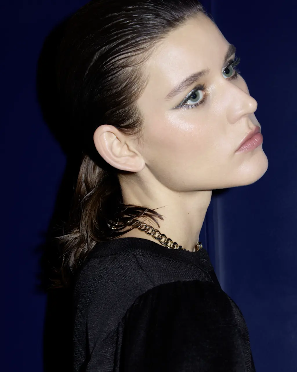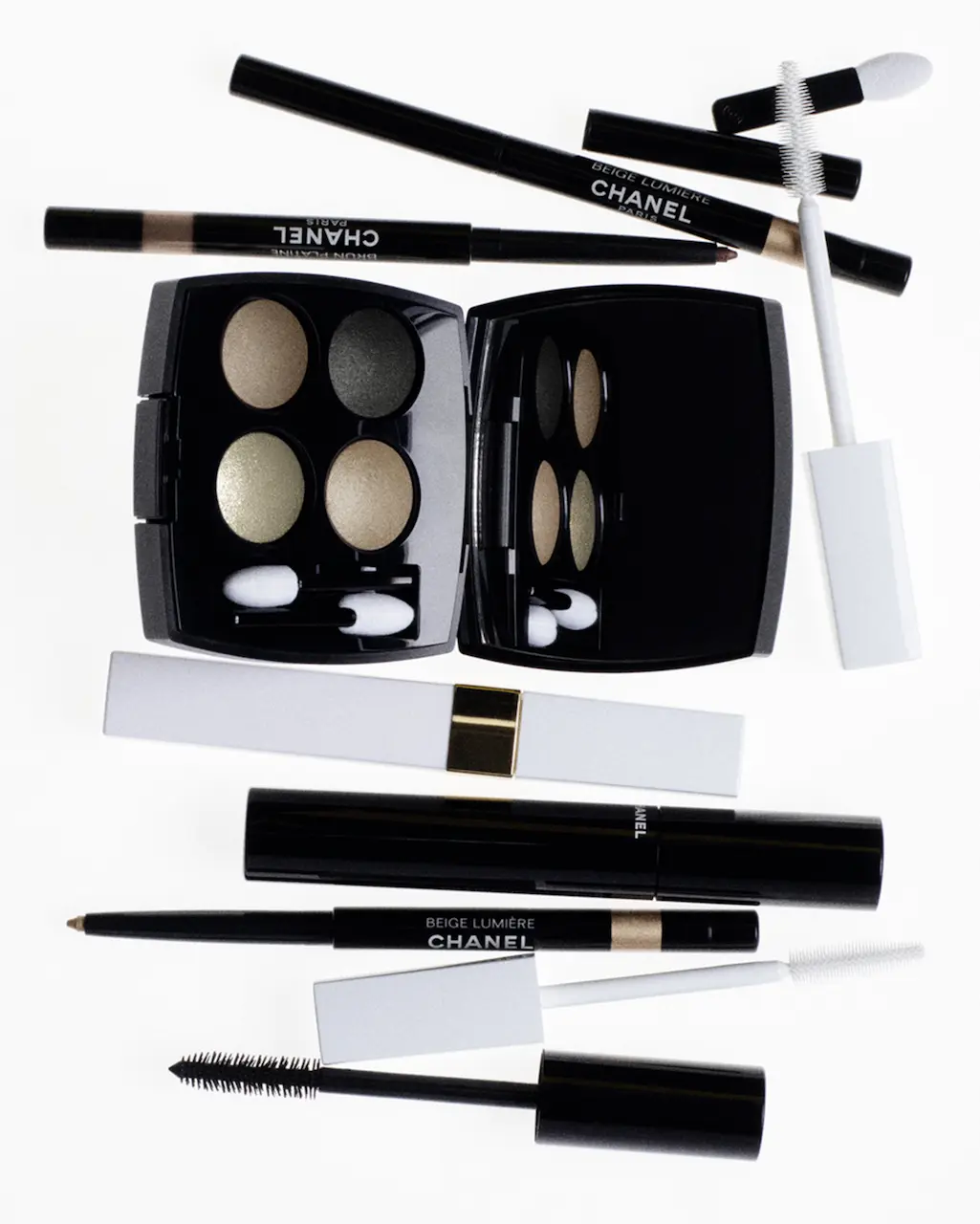 Per definire lo sguardo, applicare STYLO YEUX WATERPROOF Gris Graphite lungo la rima delle ciglia superiori e inferiori. Applicare l’ombretto kaki metallizzato su tutta la palpebra mobile, sfumandolo verso l’esterno. Per sottolineare l’angolo interno dell’occhio, applicare STYLO YEUX WATERPROOF Brun Platine e sfumare lungo la rima delle ciglia inferiori. Per intensificare lo sguardo, applicare LA BASE MASCARA e infine LE VOLUME DE CHANEL.