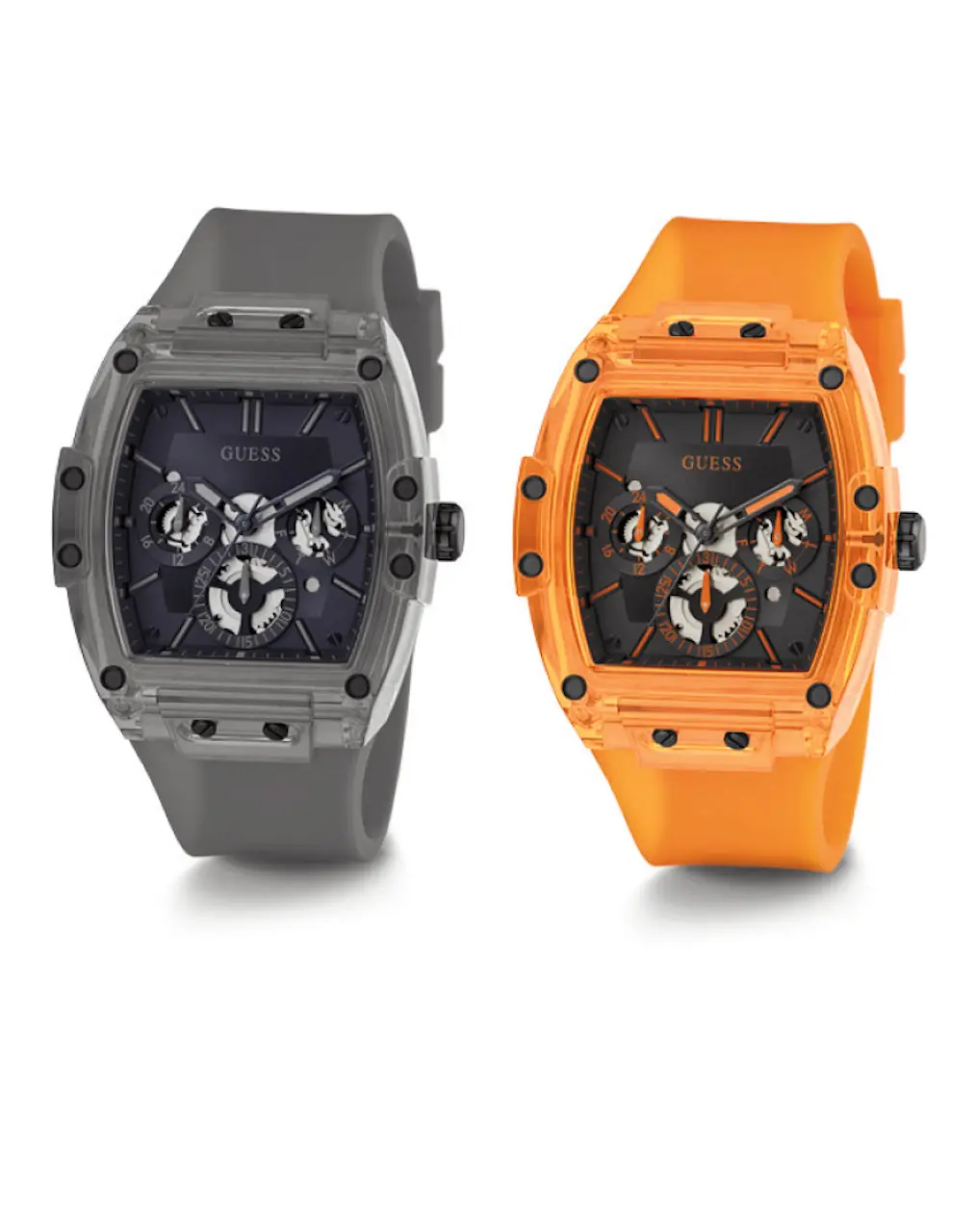 L’approccio anticonvenzionale di questi segnatempo inizia dalla cassa tonneau di 43 mm in nylon trasparente con lunetta con viti nere che ne esaltano la forza. Guess rivisita una forma tradizionale con materiali e colori all’avanguardia. Il carattere degli orologi è accentuato dal quadrante con dettagli see-thru, una finestra sugli ingranaggi dei movimenti multifunzione che li animano. La finitura sunray della parte centrale è esaltata dal contrasto con gli indici e i quadranti ausiliari. Il logo Guess compare a ore 12.