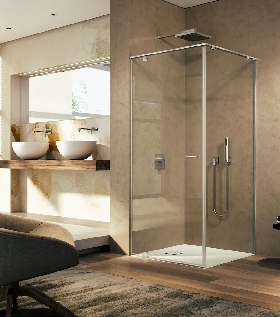 In contesti in cui si desidera massimizzare lo spazio e offrire una maggiore accessibilità, la configurazione a U rappresenta la scelta ideale. Un esempio è delineato dalla cabina doccia Look Free LU, dotata di ampia apertura con doppie porte basculanti, richiudibili a soffietto dentro e fuori la zona doccia.