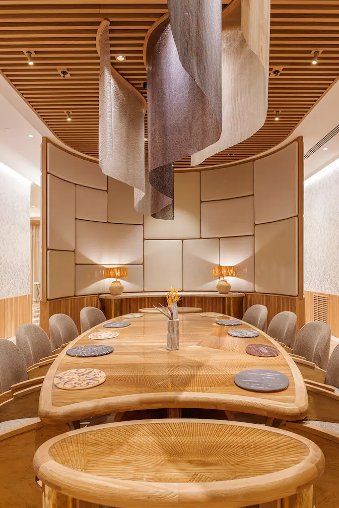 Per quanto riguarda la pasticceria, un’area al centro del ristorante è stata pensata come un albero che mette radici e si rigenera man mano che i piatti vengono preparati e serviti. E’ qui che i pasticceri, o lo Chef in persona, danno il tocco finale ai dessert, davanti ai clienti. Si tratta di un vero e proprio ponte tra la cucina e la sala da pranzo, che apre i confini tra questi due mondi, secondo le intenzioni di Marcel Ravin.