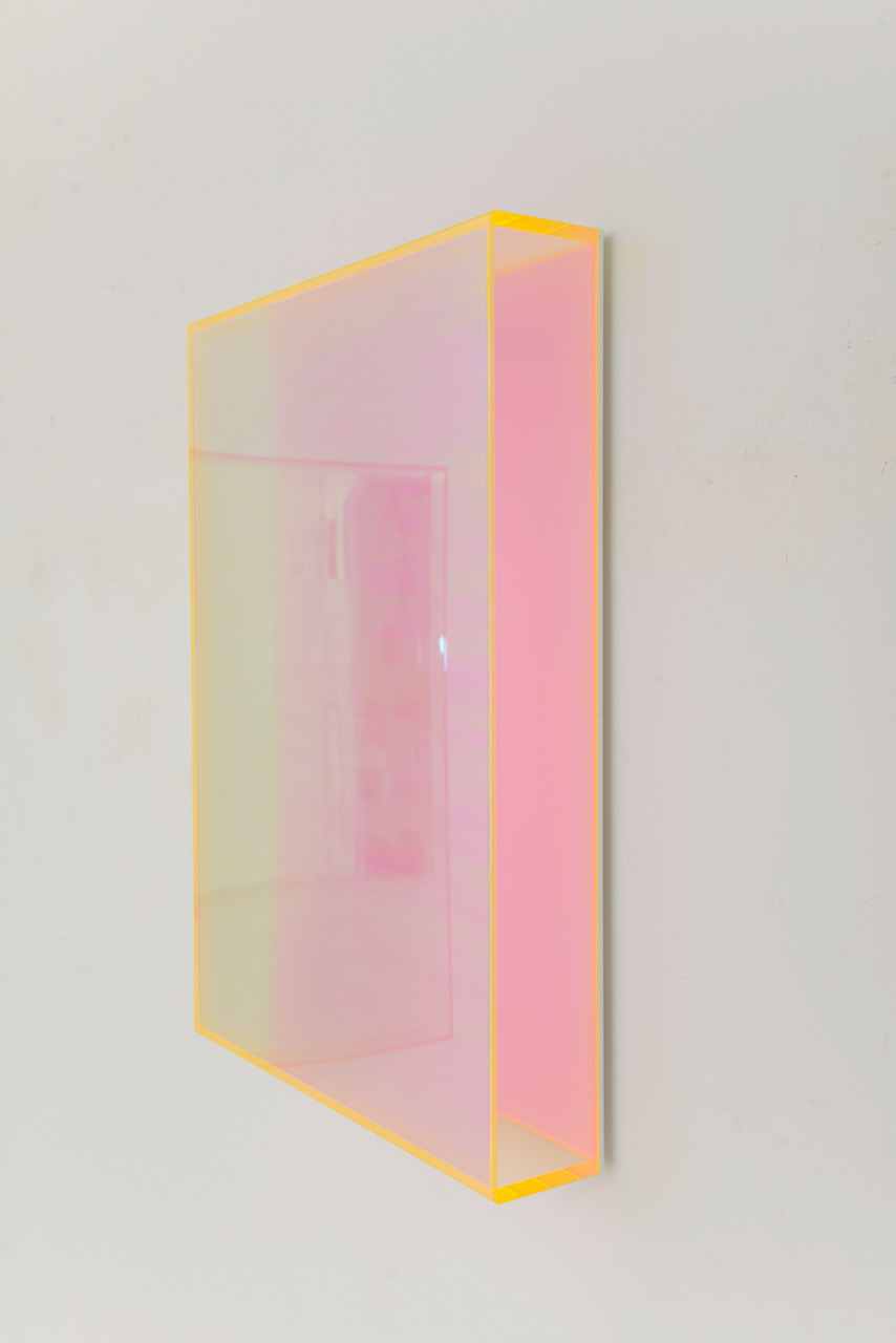 Le lastre di plexiglass creano velature di pigmento monocromatico dalle quali emerge, come in una epifania, la luce che, forgiando superfici d’energia, pervade ed interagisce con lo spazio che le accoglie.”