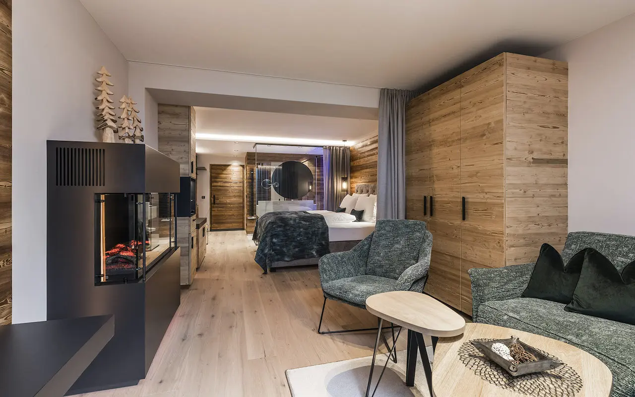 La Bad Moos Spa Suite è una soluzione esclusiva, per famiglia ma anche per la coppia, dal momento che ha al suo interno una Private Spa. A completare l’offerta caminetto The Flame, camera matrimoniale con letto king-size, angolo soggiorno separato con divano-letto, 2 bagni con doccia a pioggia, 2 Flat-TV, macchina da caffè e angolo del tè, minibar.