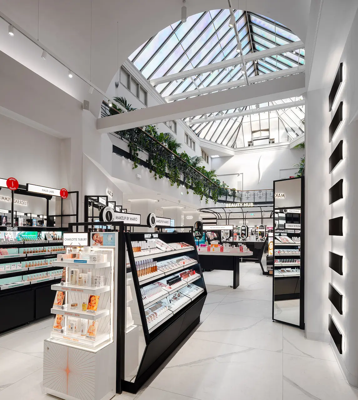 Il cuore pulsante dello store, illuminato dalla volta vetrata che ripropone in chiave moderna la copertura originale del Bazar in ferro e vetro, accoglie il vero protagonista dello store: il Beauty Hub progettato su misura per rispettare l’estetica unica dello location, permette di usufruire di un’incredibile gamma di servizi e trattamenti, eseguiti dai Beauty Advisor Sephora e dai professionisti dei brand. Infine, al primo piano,  la loggia superiore ospita un winter garden progettato in collaborazione con uno studio di paesaggistica che incornicia alla perfezione il centro dello store.