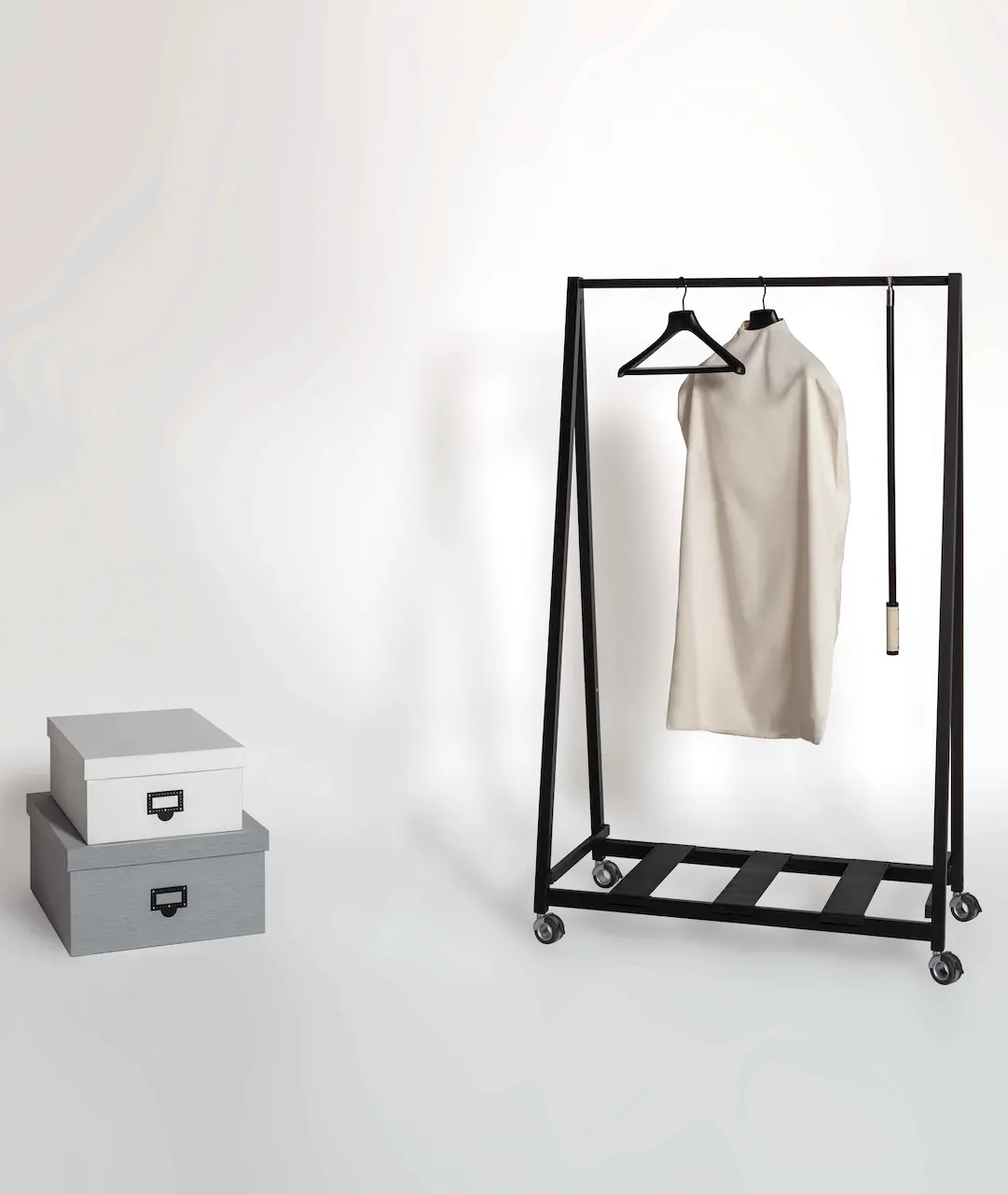 Oliver è una soluzione elegante e dinamica realizzata con struttura in legno di faggio finitura ebony 40 gloss e dettagli in pelle Black Caviar e progettata inizialmente per il mondo dell’hotellerie, declinata poi per il contesto domestico, per appendere i capi e gli accessori da utilizzare all’occorrenza in caso di ospiti o all’interno di una cabina armadio, in camera da letto o nella zona d’ingresso di casa.