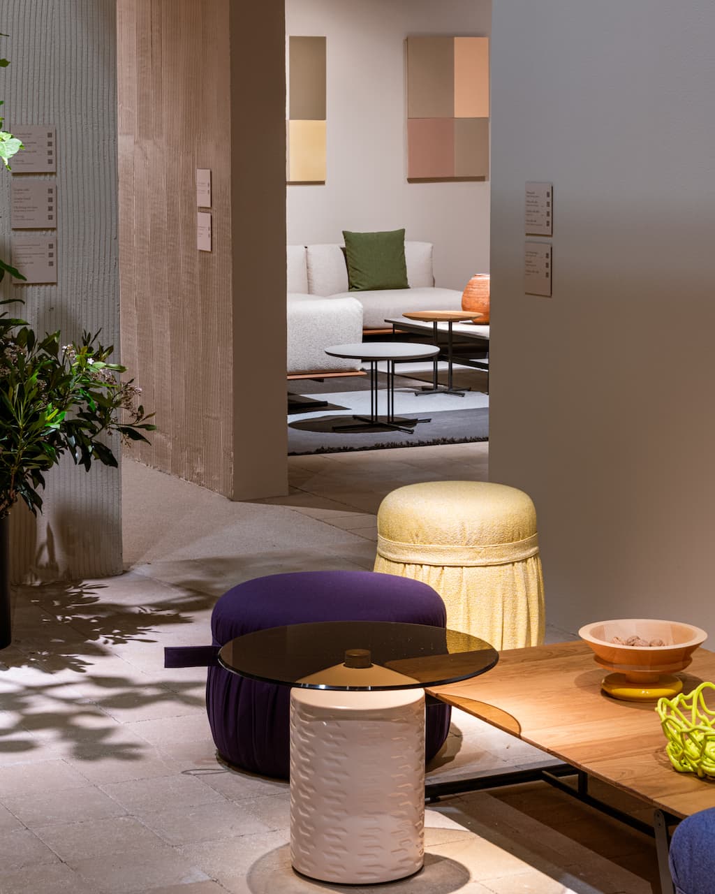 Lo stand di quest’anno è un importante cambio di passo per il brand che immagina una visione compartimentata e intima dell’abitare: la sensazione è quella di trovarsi in un ambiente domestico senza snaturare l’essenza espositiva dell’installazione. La pianta quadrata e regolare, divisa in nove stanze, viene interrotta da pareti arrotondate che accompagnano il visitatore in un percorso prospettico fluido e continuo. Le pareti, caratterizzate da una finitura tattile effetto cemento nei toni del beige caldo, costituiscono l’elemento chiave del progetto: quelle curve riprendono una texture grezza, graffiata, mentre quelle lineari si distinguono per una finitura liscia e regolare.