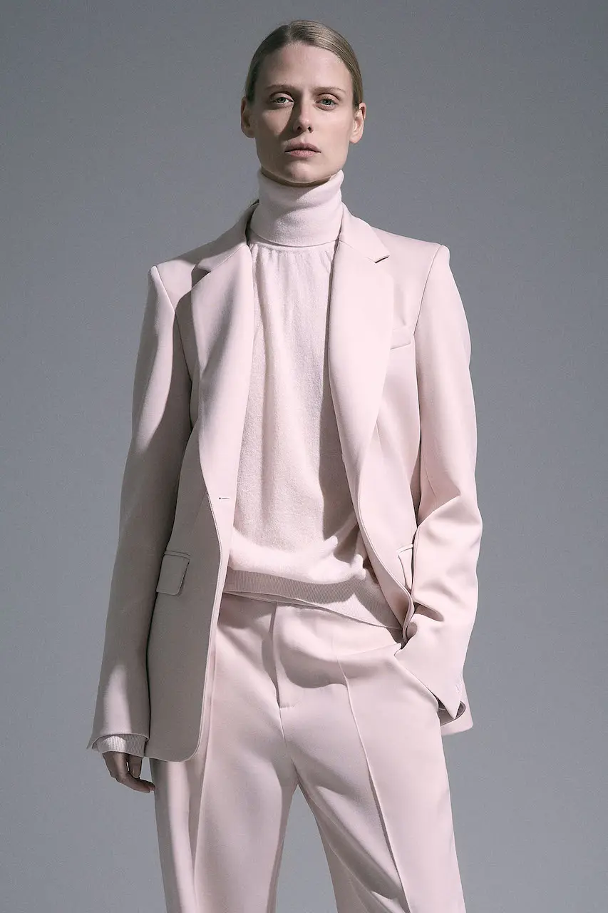 La maglieria rimane la genesi di SA SU PHI, con i maglioni iconici in cashmere dai riconoscibili dettagli a doppia costa inglese, le mantelle e i vestiti mini. La maglieria si combina a completi pantalone o gonna in flanella grigia o blu gessato, nei tailleur in lana e in cadi. Camicie e abiti in georgette di seta e pizzo francese si contrappongono ai materiali più invernali, assieme agli smoking suit in velluto di seta blu reale e rosso. I look sono completati da capospalla preziosi in doppio cashmere navy e khaki, e nei trench di gabardina di cotone cammello e verde militare. La palette di colori, che unisce toni smorzati di grigio, cammello, latte, blu scuro, verde militare con accenti di rosa chiaro, giallo pallido e rosso scuro, invita ad ulteriori interpretazioni personali in un mix and match mai scontato.
