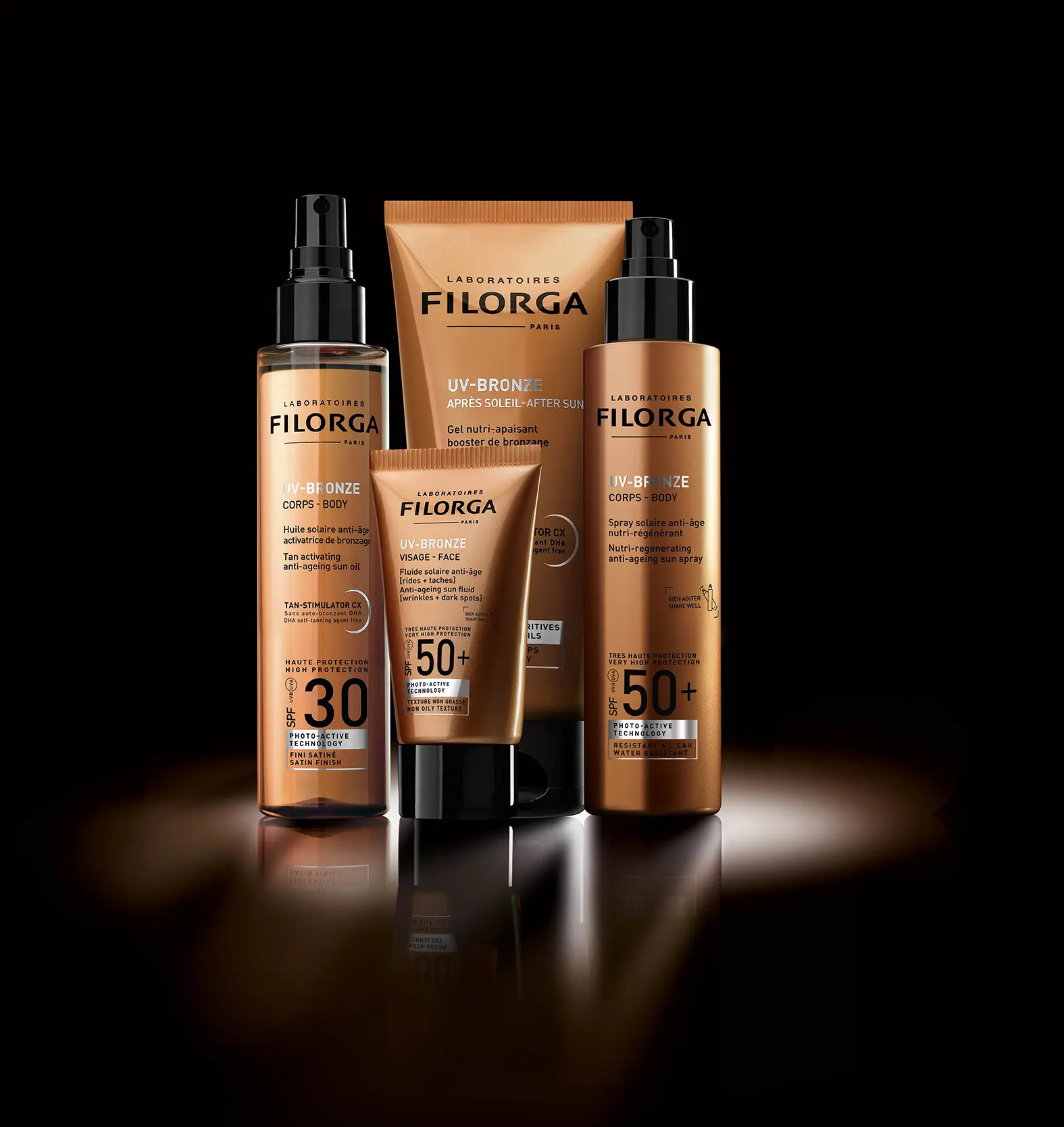 Molto più che semplici solari, i trattamenti UV-BRONZE firmati FILORGA, sono dei veri e propri prodotti pro-age. Matrichine, polisaccaridi, attivi rassodanti, attivi melano-regolatori e NCEF, il cocktail esclusivo di Filorga composto da attivi poli-rivitalizzanti e acido ialuronico, apportano alle formule un’efficacia visibile su rughe, macchie, rilassamento e disidratazione.
