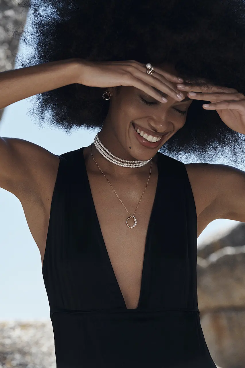 Indossa un design minimal e scultoreo con la Collana Cerchio Linea Sinuosa con Perla d’Acqua Dolce Coltivata e Pavè. Questa collana in Argento Sterling 925 presenta un pendente a forma di cerchio leggermente asimmetrico di spessore variabile, arricchito da una perla d’acqua dolce coltivata e da una fila di pavé.