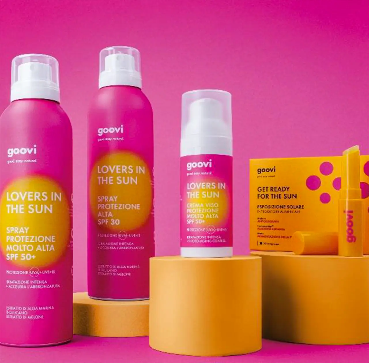 Goovi propone un percorso IN&OUT che parte con l’integrazione e arriva alle creme solari viso e corpo, per potersi godere il sole in tutta tranquillità.