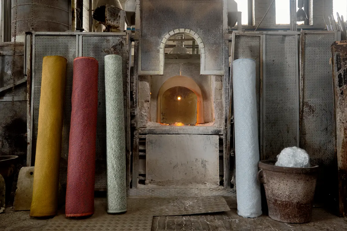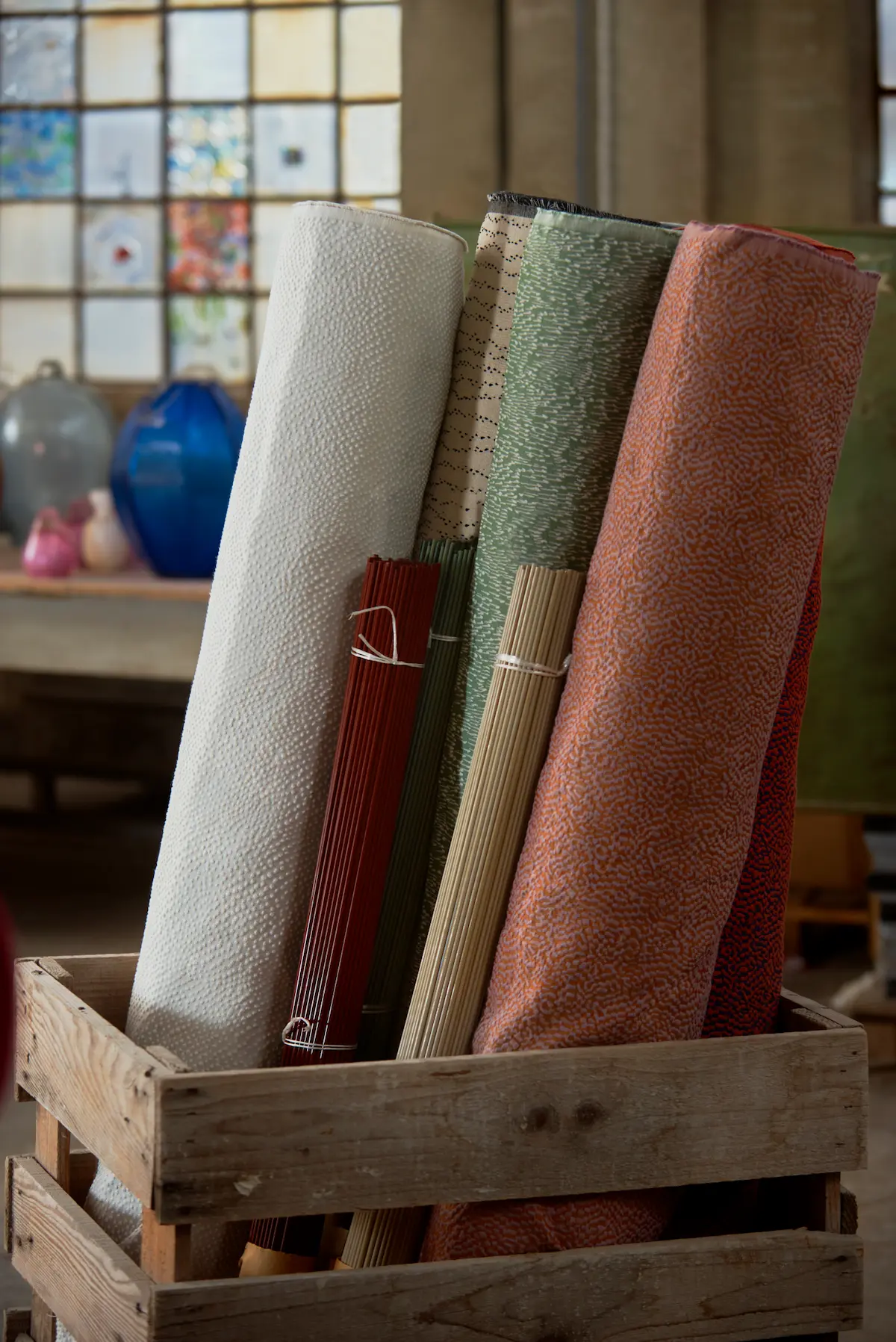 “Il mondo del vetro di Murano – raccontano Giorgia Zanellato e Daniele Bortotto – ci ha da sempre affascinato per la ricchezza di texture, colori, motivi. Ricreati attraverso molatura, bollicine o con l’utilizzo di canne colorate, le varianti che si possono ottenere con il vetro sono pressoché infinite. Abbiamo esplorato la puntinatura irregolare delle murrine per tradurla in tessuti con una particolare tridimensionalità e abbiamo cercato di riprendere quei particolari effetti del vetro dove, partendo da uno schema piuttosto geometrico, la lavorazione e le temperature che si utilizzano ammorbidiscono queste geometrie rendendole irregolari e sinuose”