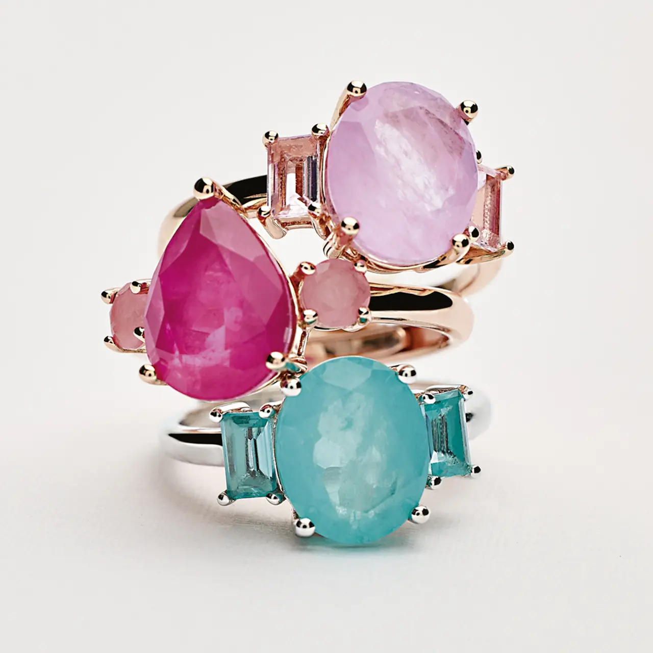 L’azzurro e il rosa, le gradazioni calde e le sfumature fredde tingono i quattro set, diversi per nuance ma ugualmente intensi per fascino, versatilità ed eleganza. Non solo: le grandi gemme utilizzate sono pietre fusion, lavorazione del cristallo di rocca che appare opalescente. Nelle due parure tono su tono nei toni pastello dell’azzurro e del rosa l’alternanza tra elementi cristallini e traslucidi rende la collezione Santorini sontuosa, glamour e di carattere. Ancora una volta il brand può contare sull’interpretazione di Federica Nargi, testimonial ideale per raccontare tutto il bello di queste collezioni.