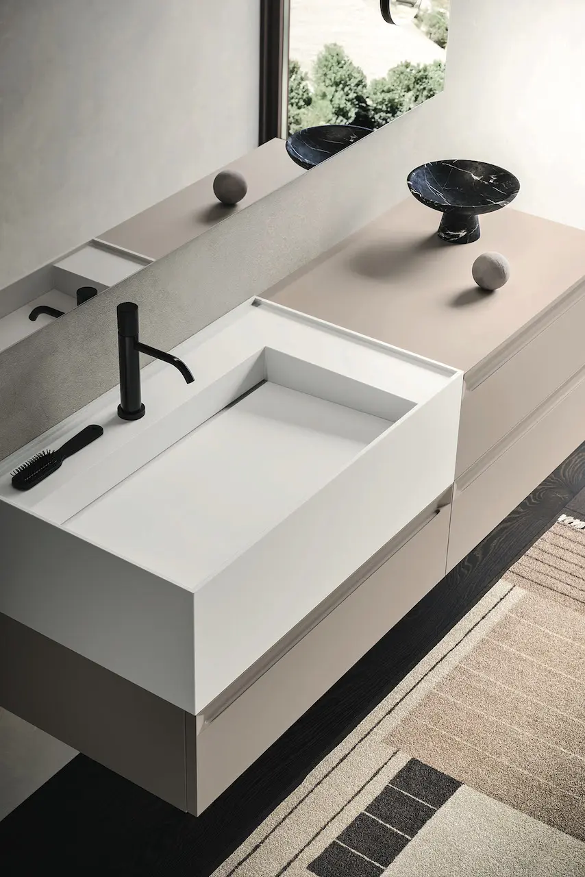 Perfetto per essere inserito in molteplici alternative di arredo proposte da Arbi Arredobagno, presentiamo l’abbinamento con una composizione appartenente alla collezione Fold, che si distingue per la presa maniglia integrata nell’anta inclinata a 45°; caratteristica che, oltre a garantire una maggiore ergonomia della presa, enfatizza l’aspetto moderno e contemporaneo delle configurazioni. Qui, il lavabo Guru 85 è abbinato al mobile sospeso in Laccato Corda opaco: una combinazione che unisce eleganza e funzionalità.