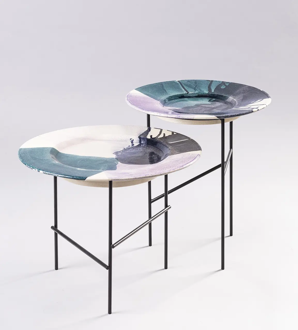Questi tavolini sono disponibili in due diverse dimensioni e altezze, offrendo versatilità e adattabilità agli spazi, mentre la struttura essenziale conferisce loro un’eleganza moderna. Il top amovibile in ceramica smaltata, realizzato con maestria artigianale da Federica Bubani, ceramista Faentina, segue la tradizione artigianale della zona.