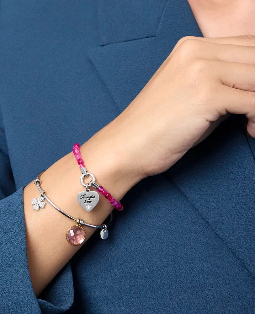 Altrettanto originale e gradevole il modello con agata rosa striata, più soft del precedente ma non meno raffinato. Si abbinerà alla perfezione persino con gli outfit delle spose, permettendo di fare la differenza. In entrambi i casi è possibile aggiungere 1 o 2 charm.