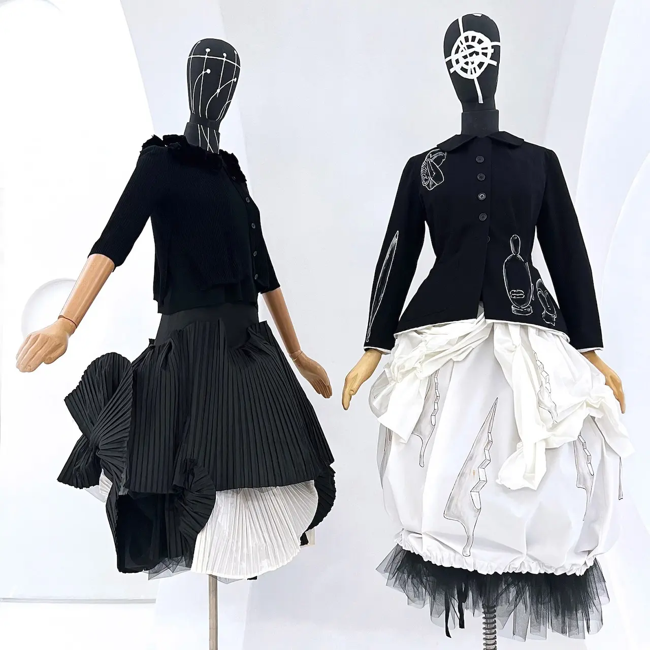 Le grandi balze bianche e nere plissé della gonna in seta evocano la tensione e il movimento della Colonna Infinita che si inerpica nello spazio e che si materializza, insieme a L’Oiseau dans l’Espace, La Negresse Blonde, Mademoiselle Pogany, Danaide, dipinta a mano, sulla bar jacket in gabardina nera.