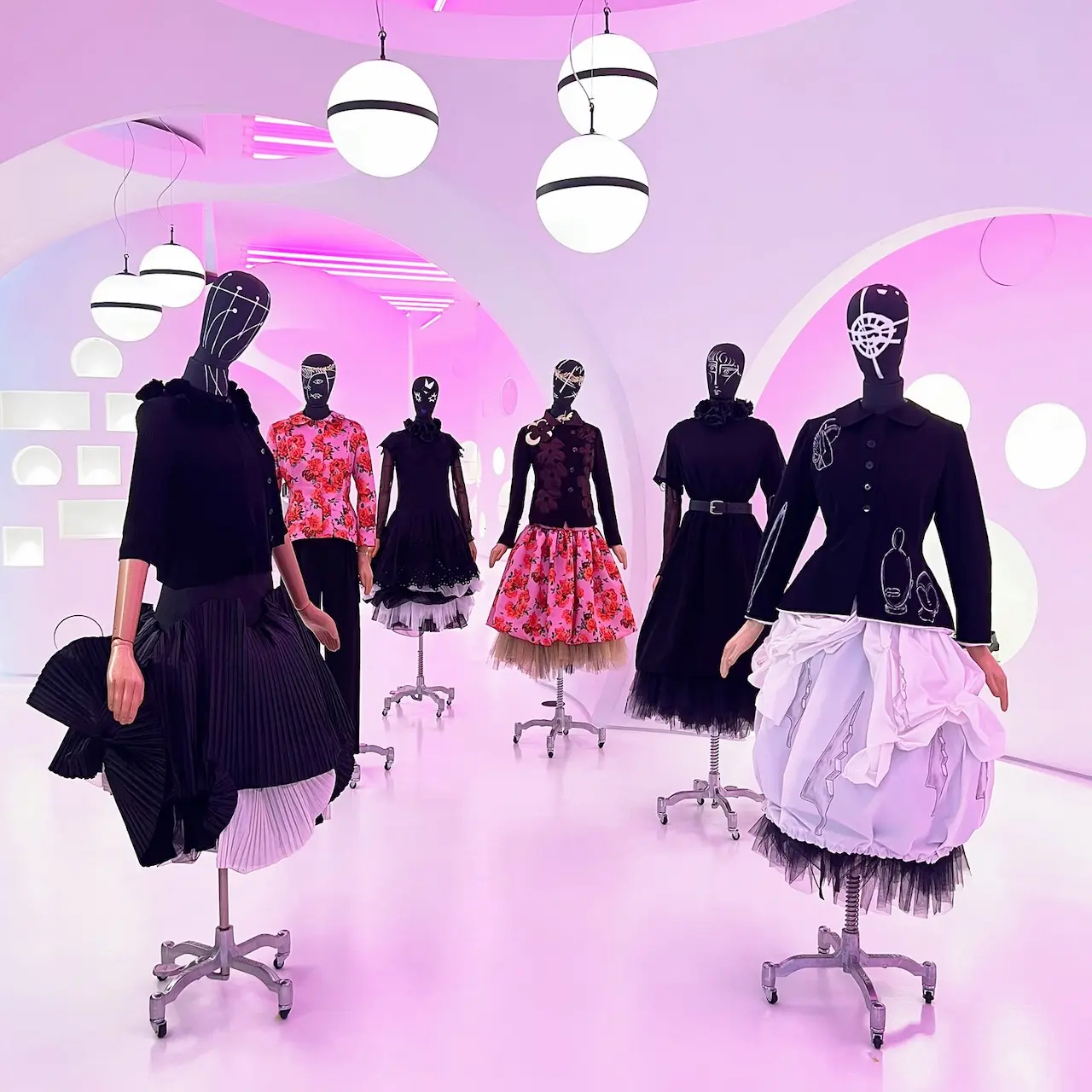 Il satin stampato a rose folk dà forma ad una gipsy bell skirt e ad una bar jacket, la Maiastra dal canto melodioso evocata da L’Oiseau dans L’Espace e Le Coq, altro mitico volatile del folklore rumeno, entrambi riprodotti dipinti a mano sul capospalla e sulla balloon skirt, ci trasportano nel mondo delle fiabe popolari in cui la moderna principessa di l’arabesque può scegliere se indossare un midi dress in sangallo traforato nero o un abito in organza ricamata con fiori in jais.