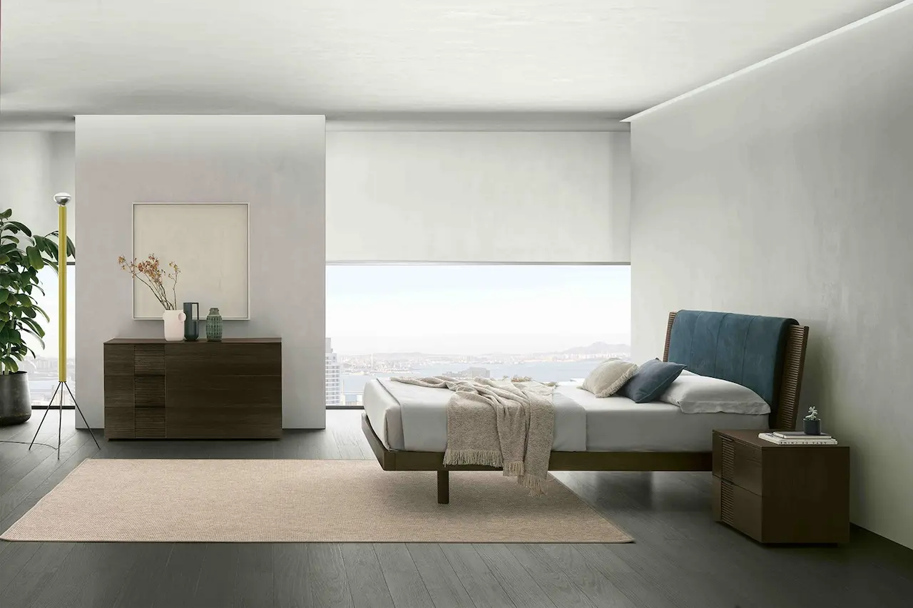 Il letto Bliss con struttura in legno ha la testiera contraddistinta da un pannello imbottito che può essere rivestito in tessuto, pelle ed ecopelle per un comfort e un’estetica personalizzati.